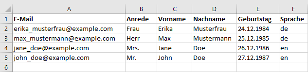 Abonnenten: ImportWahrscheinlich haben Sie bereits eine Liste von Adressen zusammengestellt, die Sie per Newsletter anschreiben möchten. Über das universelle CSV-Dateiformat lassen sich Ihre Adressen aus nahezu jeder Datenbank oder Tabellenkalkulation (z. B. Microsoft Office oder Open Office) exportieren und anschließend in EMMI importieren. Um die Zuordnung der Spalten (z. B. Vorname, Nachname, E-Mail) beim Import zu erleichtern, sollte die erste Zeile Ihrer CSV-Datei aussagekräftige Spaltenüberschriftten enthalten. Ein Beispiel:
