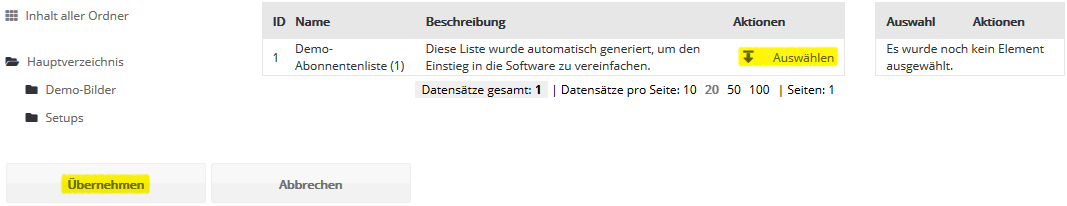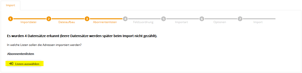 Schritt 3 - AbonnentenlistenWählen Sie nun aus, in welche EMMI Abonnentenliste ihre CSV-Datei importiert werden soll. Falls Sie zuvor keine eigene Abonnentenliste in EMMI angelegt haben (siehe Menü Abonnentenlisten), steht zum schnellen Einstieg die leere Abonnentenliste 'Demo-Liste' bereit. Diese Liste wird in der Regel bei der Einrichtung Ihres EMMI Kontos angelegt und zur Demonstration mit einem Beispiel-Abonnenten befüllt.
