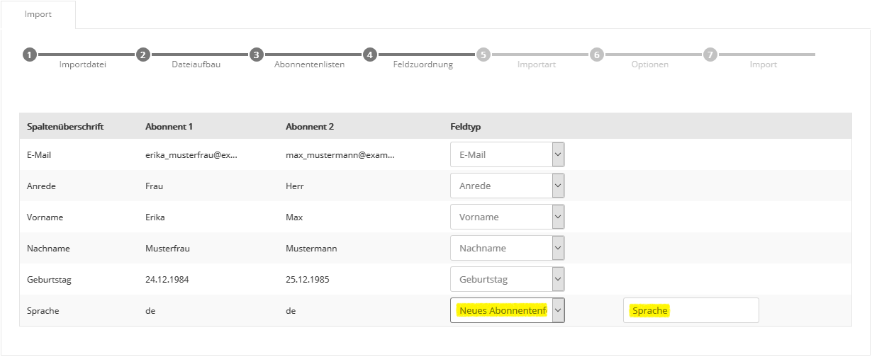 Auch die Auswahl mehrerer Abonnentenlisten ist möglich, falls Sie parallel in mehrere Listen importieren möchten. Klicken Sie nach Auswahl der gewünschten Liste(n) auf 'Übernehmen' und anschließend auf 'Weiter'. Der Name einer Abonnentenliste lässt sich im Menü Abonnentenlisten auch nachträglich jederzeit ändern. Schritt 4 - FeldzuordnungIn Schritt 4 teilen Sie EMMI mit, welche Spalte (z.B. Vorname, Nachname) Ihrer CSV-Datei in welches EMMI Abonnentenfeld importiert werden soll. Zum schnellen Einstieg sind typische Abonnentenfelder wie 'E-Mail', 'Anrede', 'Vorname' und 'Nachname' in EMMI bereits vorhanden.