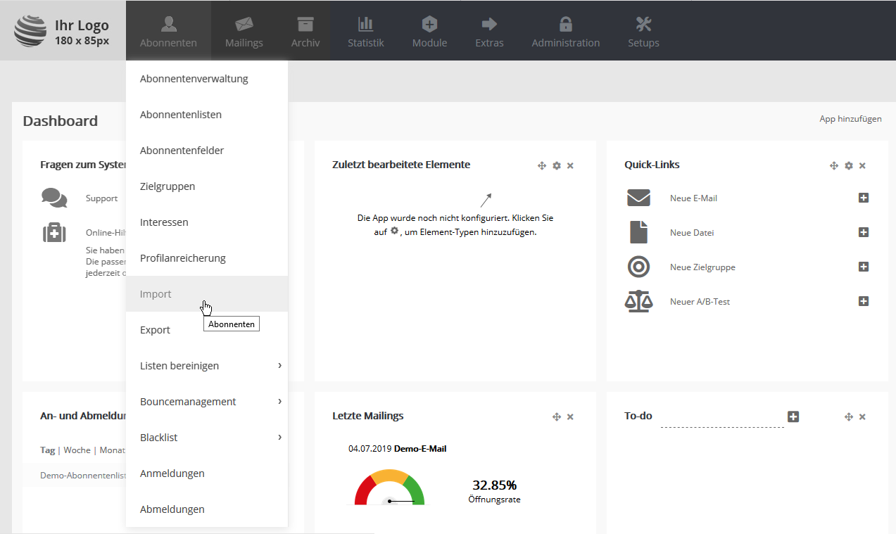 Zum Abspeichern Ihrer Daten wählen Sie bitte je nach Version Ihres Office-Paketes das Exportformat CSV UTF8 (Trennzeichen-getrennt) oder CSV (Trennzeichen-getrennt). Import Schritt für Schritt erklärtUm Ihre CSV-Datei in EMMI zu importieren, wählen Sie im Menü 'Abonnenten' den Punkt 'Import':