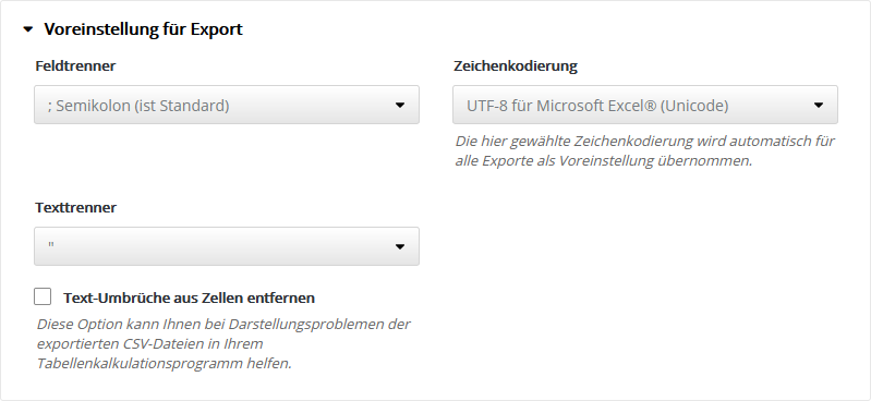 Folgende 'HTML-Editoren' sind in EMMI integriert und nutzbar: Grundeinstellung ExportHier legen Sie die Voreinstellung für den Export von CSV-Dateien fest, z. B. für den Export von Abonnentendaten. Bei der Durchführung jedes Exportes können Sie bei Bedarf auch eine abweichende Einstellung wählen. Standardeinstellung ist die Option 'UTF-8 für Microsoft Excel® (Unicode)', technisch gesprochen 'UTF-8 mit BOM'. Dieses Format wird von den meisten Officeanwendungen automatisch erkannt, so dass Umlaute und Sonderzeichen ohne manuelle Formatwahl korrekt importiert werden. StatistikeinstellungenTragen Sie Ihre eigenen Maximalwerte ein, um die rot|gelb|grün Farb-Umschaltung der Statistik-Anzeige für Öffungsrate, Klickrate und Bouncerate an die typischen Werte Ihrer Mailings anzupassen. Nur Ihre besten Mailings sollten den grünen Bereich erreichen. Die Farb-Umschaltung erfolgt automatisch in Drittel-Stufen des eingetragenen Maximalwertes. Empfehlung: Notieren Sie aus der Statistik Ihrer bisherigen Mailings die Durchschnittswerte für Öffnungsrate, Klickrate und Bounces. Damit dieser Durchschnittswert zukünftig im mittleren Drittel der Skala landet, tragen Sie das Doppelte dieses Wertes als Maximum in das jeweilige Feld ein. Tragen Sie z. B. 30% als Maximum ein, dann werden anschließend die Werte bis 10% rot, bis 20% gelb und darüberliegende Werte grün gefärbt. Sie sehen sofort, ob Ihr aktuelles Mailing über- oder unterdurchschnittlich abschneidet. Typische Durchschnittswerte: