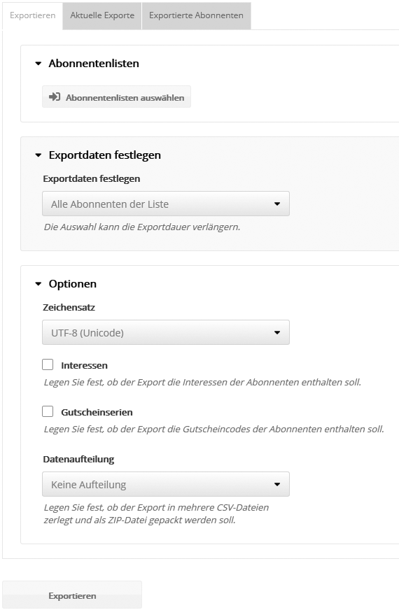 Im Reiter 'Exportierte Abonnenten' erfolgt eine Detailansicht über die exportierten Datensätze. Zum Download der Export-Datei klicken Sie schließlich auf 'Download'.