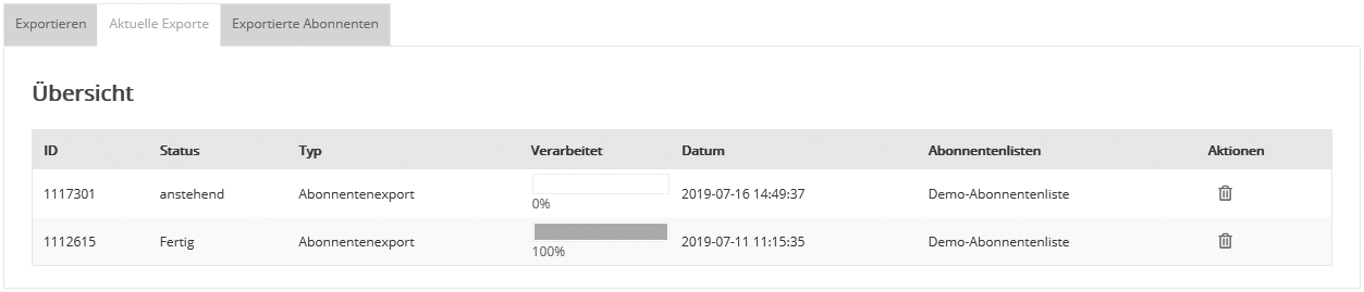 Durch Klick auf die Schaltfläche 'Exportieren' startet EMMI den Export und wechselt zu 'Aktuelle Exporte'. Hier sehen Sie den Fortschritt des aktuellen Exports. Dem Verlaufsbalken sowie dem jeweils angezeigten Status entnehmen Sie, wann der Export erfolgreich abgeschlossen ist. Im Reiter 'Exportierte Abonnenten' finden sie die Export-Datei, die Sie nach einem Klick auf 'Download' auf Ihrem Computer speichern können.