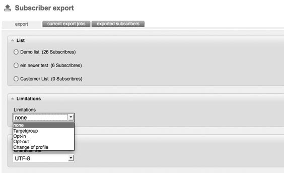 Subscribers lists can be exported from EMMI as CSV – files. An advantage, for example, is that you can back up the address lists in this way. In the tab 'Export’, you can make choices of the lists that have to be exported. Per export only one subscriber list can be chosen. If you only want to export certain data records, you can decide on 'Limitations’. |