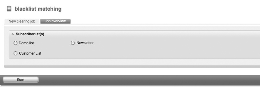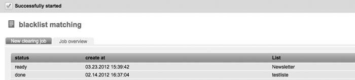 | You will find information on the blacklist and its function in 2.11 Blacklist. Via the function 'Blacklist matching', you can coordinate the data records of your subscriber lists with the entries in your blacklist. Detected subscribers will automatically be deleted by EMMI. First, you have got to choose the subscriber list which has to be examined. By clicking the 'OK' button, you will confirm the appearing message to delete the search results. The result will show you how many subscribers were removed due to the fact that they are registered in the blacklist. |