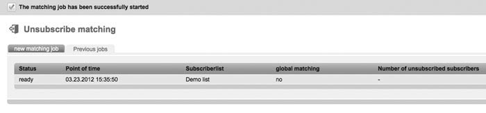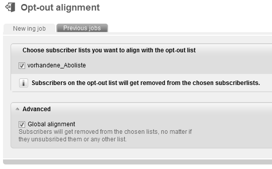 Data records of subscribers, who opted out their email addresses due to the fact that they do not wish to receive emails anymore, can be deleted from one specific or all lists with the help of this function. This function is especially useful after the 'Import'. By running an Opt-Out Matching you will ensure that opted-out subscribers will definitely be deleted from lists and do not receive any mailings anymore. |