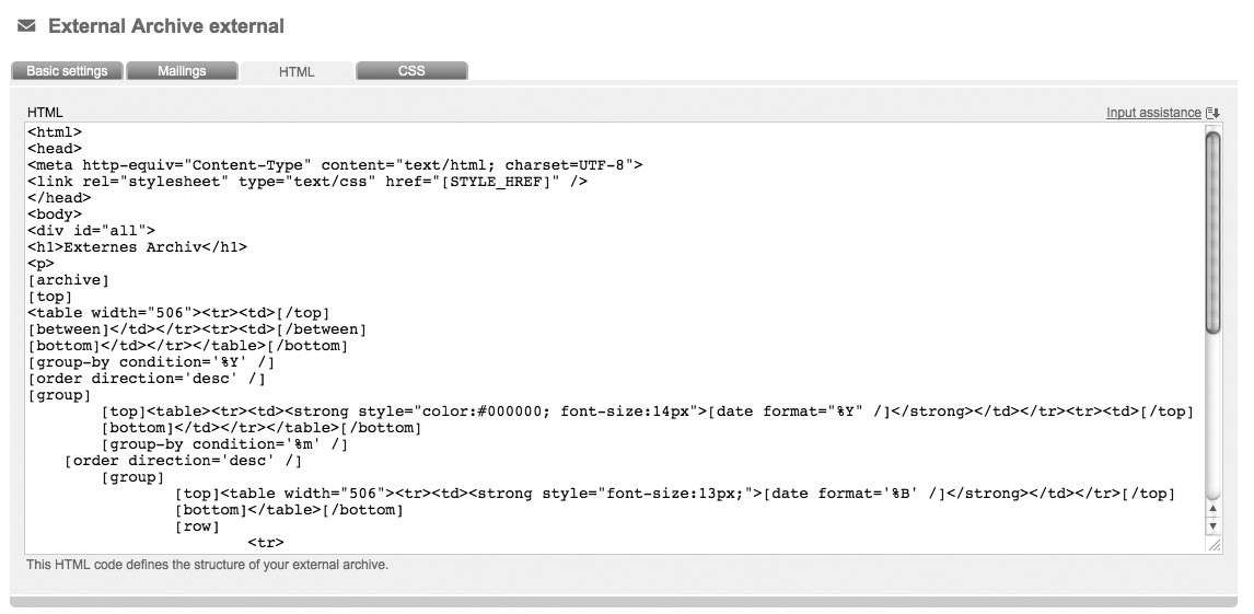 While creating your external archive, EMMI generates an html source code in the background, which defines the structure of your external archive. If you want to edit the look of your shown archive, you have to edit the source code, which requires appropiate HTML knowledge.