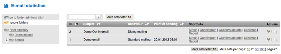 Here you find the statistics of all sent mails. For easier access EMMI already includes a demo-mail you can view. |