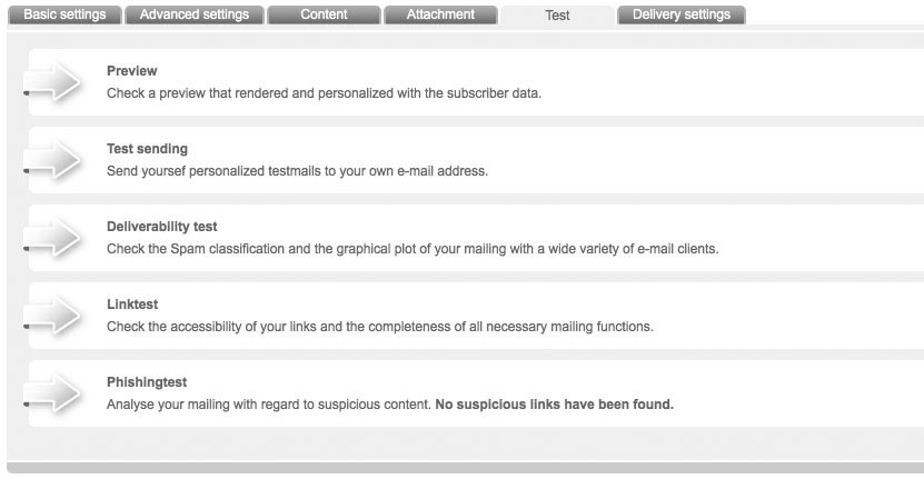 Having finished your newsletter, EMMI offers you numerous testing possibilities. This helps you to optimize your mailing and achieve maximum success before actual dispatch. You can get to the testing functions by choosing the tab 'Test' in the menu in which you edit your mailing. Following tests are available: |