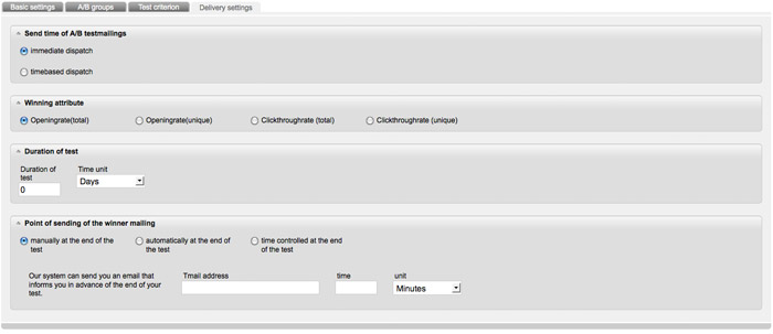 In the last tab you define the settings for the dispatch. Determine by which criterion (opening-rate or click-through-rate) EMMI should identify the winner. Equally important is to determine the duration of the test.