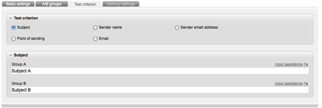 In the tab 'A/B groups' you can select the number and size of your test group. In the next tab you have to choose the 'test criterion'. Please select different subject lines, sender names, sender adresses or different sending point. Furthermore you are able to compare completely different newsletters. Of course you have to create the comparison mailing in the e-mail office at first.