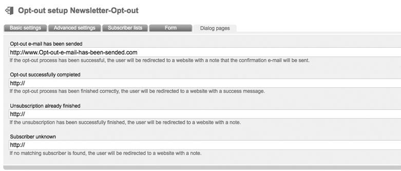 Enter a name and an optional description. Choose the 'mode' (important). The following modes are supported by 'EMMI': Double-optout with confirmation e-mail: after unsubscribe from your website or your newsletter a confirmation email will be send automatically. Optout will be activated after clicking the confirmation link in this email. After successful unsubscription the former subscriber will get a last email („You unsubscribed successfully of our newsletter.“) Double Optout: Like described before, but without sending of a „successful unsubscription“ e-mail Confirmed Opt-Out (recommended): After unsubsubscription on your website or in your newsletter a „successful unsubscription“ email will be sended immediately. Single Optout: No e-mails will be send. There just will be a message in your browser, that optout was successfull. In Tab 'advanced settings' you can deposit your e-mail address in field 'e-mail forwarding', to be informed about unsubscriptions. Tab 'subscriberlists': Choose your favorite subscriberlist(s), where all unsubscriptions should be logged out. Select the subscriberfields, which should be filled out by your subscribers in tab 'Form'. After clicking 'create form fields' a popup appears, where you can choose and add subscriber fields to your form. Click 'sort formular fields' to arrange your fields. Click 'test form' to open a new tab in your browser with a preview of your form. Source Code of your website is genereated by 'EMMI' by clicking 'Formular soruce code'. A popup appears with your source code. Last tab: Dialog pages |