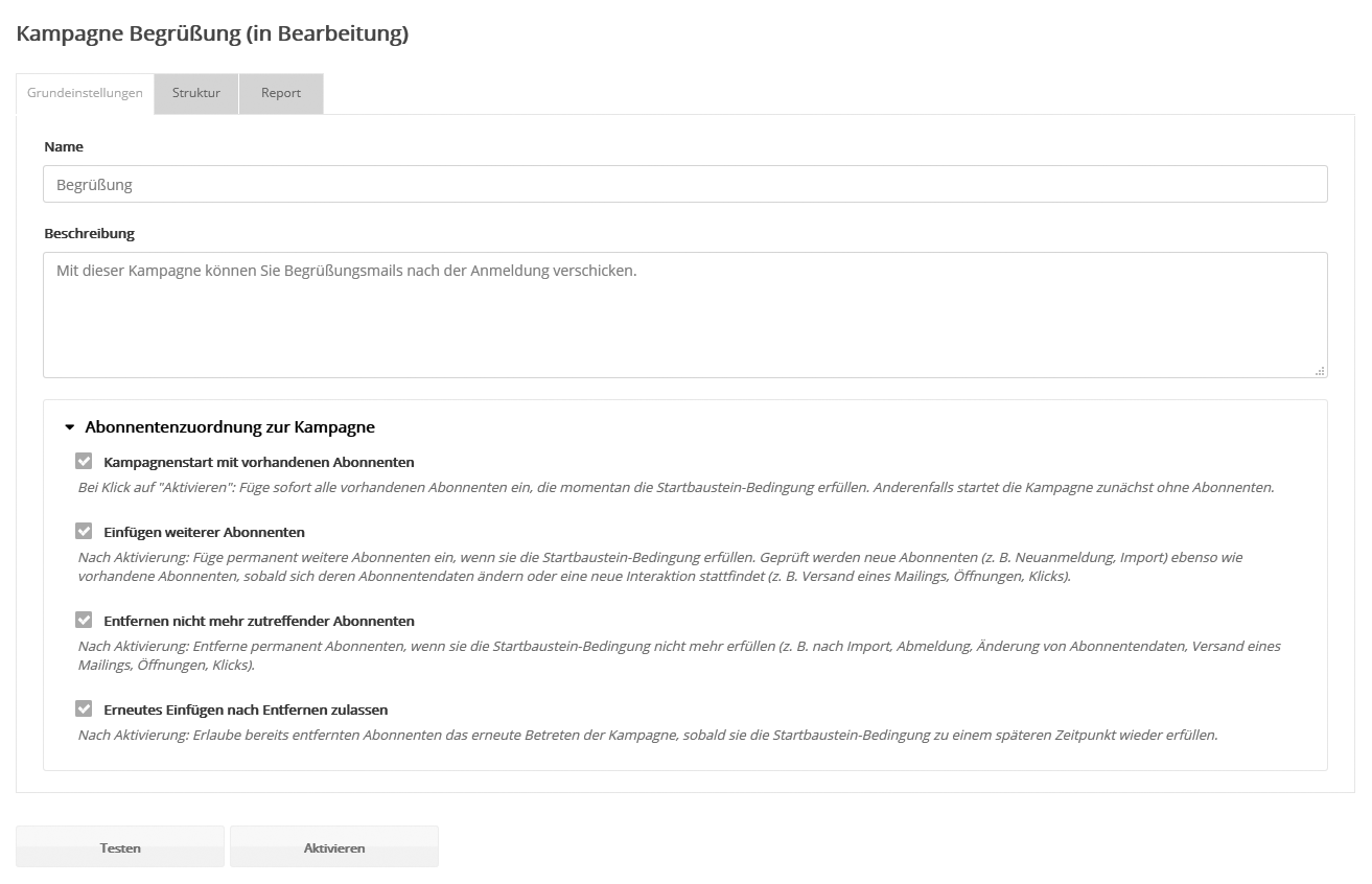 Ist die Option 'Einfügen weiterer Abonnenten' dagegen nicht aktiviert, betritt kein zusätzlicher Abonnent eine laufende (oder pausierte) Kampagne.
