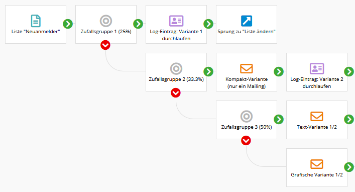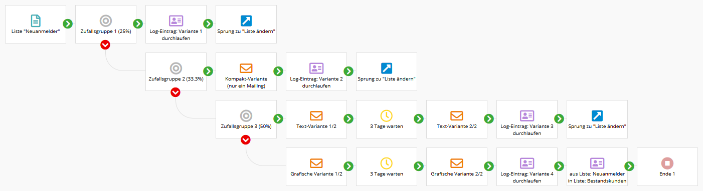 - Der erste Bedingungsbaustein 'Zufalls-Gruppe 1' enthält eine Zielgruppe mit 25%iger Auswahl-Wahrscheinlichkeit, d. h. ungefähr 25% der Abonnenten folgen dem grünen Pfeil zu Variante 1.